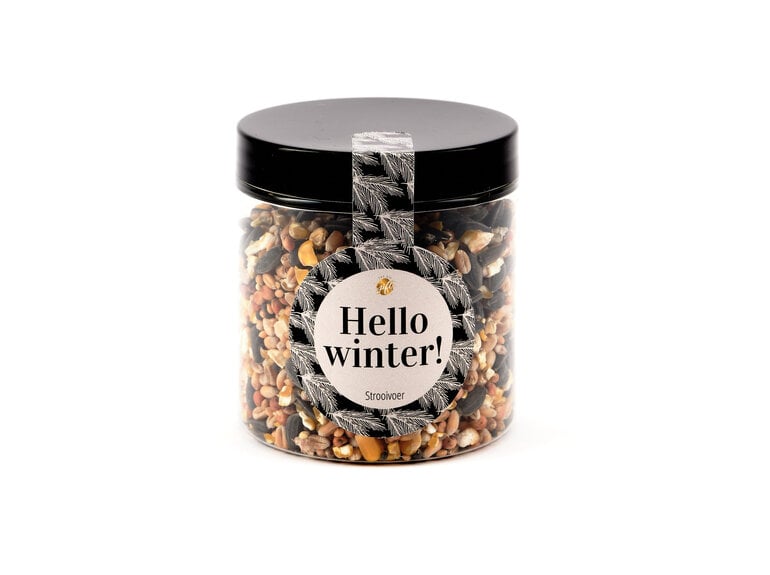 potje met zaden om de vogels te voeren met opschrift: Hello winter